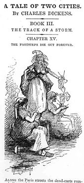 다음날 Darnay의 재심은 Defarges의 새로운 비난과 Defarge가 Manette 박사의 감옥을 수색할 때 발견한 원고를 기반으로 합니다. Defarge는 재판소에서 원고를 읽습니다. 여기에서 Manette 박사는 자신이 범죄를 신고하려고 시도한 후 Evrémonde 형제(Darnay의 아버지와 삼촌)의 손에 투옥되었다고 기록했습니다. Darnay의 삼촌은 농부 소녀를 납치하고 강간했습니다. 남동생을 먼저 숨겨둔 오빠는 칼로 자신을 찌르는 삼촌에게 맞서러 나갔다. 마네트 박사의 최선의 노력에도 불구하고 누나와 남동생은 모두 죽었다. Manette 박사의 원고는 Evrémondes, "그들과 그들의 후손이 그들의 종족의 마지막까지"라고 비난하면서 결론을 내립니다. [9]배심원단은 그것을 Darnay의 유죄에 대한 반박할 수 없는 증거로 받아들이고 다음날 오후 그는 단두대 에서 사형을 선고받습니다 .
