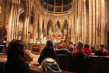 가톨릭 교회 의 로마 예식 에서 대림절은 11월 30일 또는 그와 가장 가까운 일요일의 초저녁기도(저녁기도 I)로 시작하여 크리스마스 초저녁기도(저녁기도 I) 전에 끝납니다. [11] 대림절 첫날은 또한 새로운 전례력을 시작합니다 . 카톨릭 교회의 암브로시안 의식 과 모자라빅 의식 에서 대림절은 크리스마스 전 여섯 번째 일요일, 즉 성 마틴의 날 ( 11월 11일 ) 다음 일요일에 시작됩니다. [12]