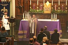 대략 13세기 이후로 대림절을 위한 서구 기독교 의 일반적인 전례 색상은 보라색이었습니다. 교황 인노첸시오 3세는 검은색이 강림절에 적합한 색이라고 선언했지만 Saint-Pourçain의 Durandus는 보라색이 검은색보다 선호된다고 주장했습니다. [24] 보라색 또는 보라색은 종종 성직자의 의복인 전두엽 ( antependia) 에 사용되며 종종 성막 에도 사용됩니다 . Advent의 세 번째 일요일 Gaudete Sunday 에는 사순절 네 번째 일요일 인 Laetare Sunday 에 사용 된 장미를 참조하여 장미를 대신 사용할 수 있습니다 . [25]서방 기독교에서 장미빛 촛불은 대림절 셋째 주일에 켜지는 기쁨의 표시( Gaudete )로 언급됩니다. [26]