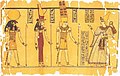 Theban Triad : Amun , Mut 및 Khonsu 와 이야기하는 Ramesses III . 대영 박물관 의 '그레이트 해리스 파피루스' , c. 기원전 1150년 Jean Vercoutter 의 책 The Search for Ancient Egypt (p. 91) 에서 가져온 이미지입니다 .