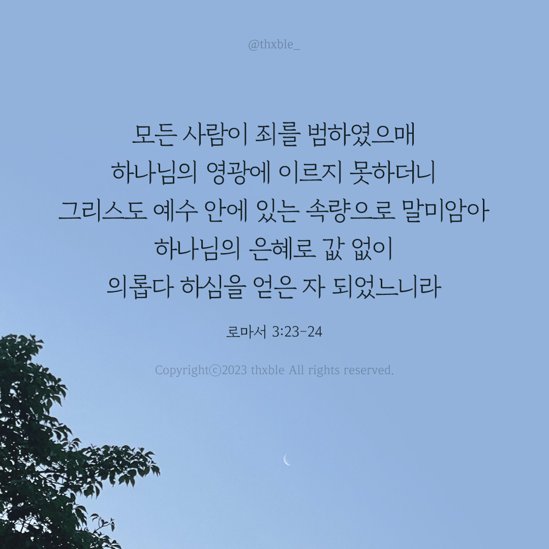 “모든 사람이 죄를 범하였으매 하나님의 영광에 이르지 못하더니 그리스도 예수 안에 있는 속량으로 말미암아 하나님의 은혜로 값없이 의롭다 하심을 얻은 자 되었느니라” -로마서 3:23–24