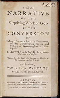 이러한 좌절과 종교적 열정의 냉각에도 불구하고 노샘프턴 부흥과 에드워즈의 리더십 역할에 대한 소문은 영국과 스코틀랜드까지 퍼졌습니다. 이때 Edwards는 1739~40년에 부흥 여행으로 13개 식민지를 여행하던 George Whitefield 를 알게 되었습니다. 두 사람은 모든 세부 사항에 대해 의견이 일치하지 않았을 수도 있습니다. Whitefield는 Edwards보다 부흥의 강렬한 감정적 요소에 대해 훨씬 더 편안했지만, 둘 다 복음 전파에 열정적이었습니다. 그들은 처음에는 보스턴을 거쳐 노샘프턴까지 Whitefield의 여행을 조율하기 위해 협력했습니다. Whitefield가 Northampton에 있는 Edwards의 교회에서 설교했을 때, 그는 그들에게 불과 몇 년 전에 겪었던 부흥을 상기시켰습니다. [30]이 말은 에드워즈에게 깊은 감동을 주었고, 예배 내내 눈물을 흘렸고, 많은 회중도 감동을 받았습니다. [ 인용 필요 ]