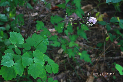 은꿩의다리는 실처럼 가는 자줏빛 수술대 위에 흰꽃이 달리고