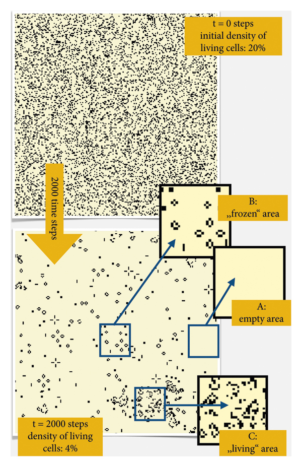 그림 1 은 GoL 시뮬레이션 실행의 일반적인 예를 보여줍니다. 초기에 무작위로 분포된 살아있는 세포(이 경우 모든 세포의 20%)에서 패턴 형성 및 자기 조직화가 시작되어 여기에 표시된 2000 시간 단계의 런타임 이후 시스템의 모양을 형성했습니다. 인구밀도는 대략 인구밀도 수준으로 급격하게 감소했습니다. 이 기간의 4%와 "세계"는 다양한 구성의 살아있는 세포가 거주하는 여러 영역을 보여줍니다. 전체적인 풍경은 3가지 전형적인 지역 유형으로 특징지어질 수 있습니다. 일부 지역에는 살아있는 세포가 고갈되어 있고(빈 지역, A ) 일부 지역에는 고정된 패턴만 포함되어 있거나(블록, 벌집, 빵 등) 단순한 형태가 있습니다. 진동 패턴(예: 눈가리개)을 배치하여 인구 역학이 정지되었습니다("동결" 영역, B ). 동시에, 패턴 형성 프로세스가 집중적으로 작업하여 빠르게 변화하고 역동적인 패턴을 생성하는 일부 영역("생활" 영역, C )이 있습니다. 빈 영역( A )은 Wolfram 클래스 I에 해당하고, "동결" 영역은 Wolfram 클래스 II에 해당하며, "살아있는" 영역은 Stephen Wolfram이 지정한 명명법에 따라 Wolfram 클래스 IV에 가장 잘 해당 합니다 .