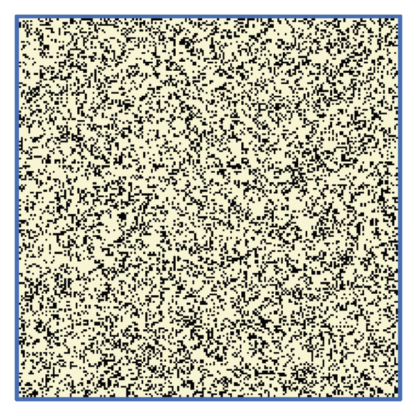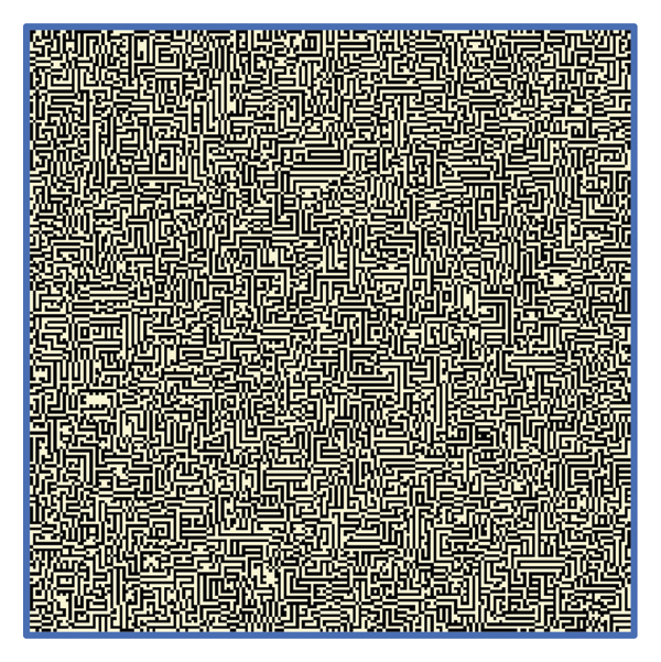 그림 8 은 이 세포 자동 장치가 완전히 "동결된" 미로 같은 패턴으로 수렴되는 것을 보여줍니다. GOL에 대한 그림 5 에 표시된 것과 유사한 이 규칙 세트의 미세한 모델은 4~5개의 살아있는 이웃 사이의 LTNPD를 예측하며 다음 값을 가리킵니다.. 이는 대략 인구 밀도로의 수렴을 제안합니다. 56%. 이 세포 자동 장치에 대한 5000단계 긴 시뮬레이션을 30회 반복한 결과 LTNPD의 중앙값은또는 대략. 51%로 순수 현미경 모델로 예측한 값에 매우 가깝습니다.