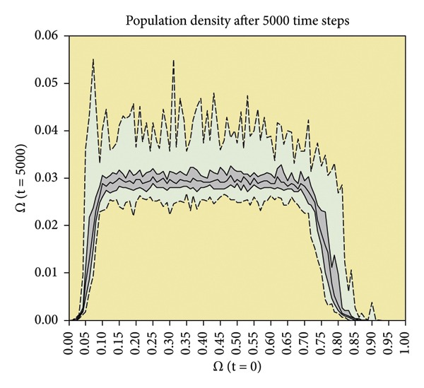 , 그 이하에서는 시스템이 완전히 멸종되는 경향이 있으므로. 밀도가 높을수록 덜 날카로운 상전이가 발생하여 최종 밀도가 대략적으로 감소하기 시작합니다. ~에이상, 위의 거의 모든 경우에 완전한 멸종을 보여줍니다.. 값 사이의그리고, 대다수의 실행에서 최종 밀도가 주변 값으로 수렴하도록 유도하는 시스템 체제가 작동하는 것 같습니다.. 모집단이 초기 밀도의 하한 임계 경계에 거의 정확히 수렴하는 것으로 보인다는 점은 주목할 만합니다. 흥미롭게도 GoL 시스템은 무작위 인구인 경우 지속 가능하지 않은 전 세계 인구 밀도로 스스로를 몰아갑니다. 이러한 결과는 일부 시작 조건에 대한 GoL [ 19 ] 의 시끄러운 비동기 업데이트 절차에 대한 연구에서 보고된 내용과 잘 일치합니다여기서는 LTNPD가 이러한 초기 조건에 어떻게 의존하는지에 대한 완전한 보기를 갖기 위해 가능한 초기 밀도의 전체 범위에 대해 더 미세한 단계로 매개변수 스윕을 수행했습니다. 이러한 관찰이 신흥 인구 역학에 하나 이상의 수렴 지점이 존재하기 때문이라는 것을 보여주기 위해 최종 인구 규모뿐만 아니라 인구의 역학을 연구하기 위한 두 번째 실험이 수행되었습니다.