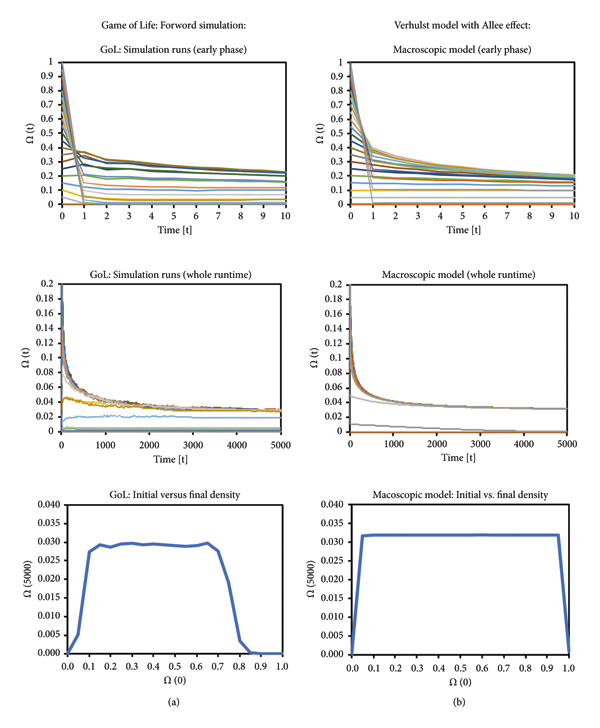 (a) 에 묘사된 개별 실행을 살펴보면 초기 정지 상태에 있는 실행(그림 3 의 직선 수평선)이 "동결"되고 빈 영역만 있는 구성에 도달했음을 알 수 있습니다. 이러한 실행은 여전히 매우 역동적인 실행(그림 3 의 흔들리는 선 )보다 낮은 LTNPD를 갖는 경향이 있으므로 여전히 "살아있는" 영역을 포함합니다.그리고, 동결 및 빈 실행보다 높은 것입니다. 그림 3 의 하위 그래프 오른쪽 열은 의최종 값 분포를 보여줍니다 . 이러한 분포는 표 2 에도 수치로 나와 있습니다. 두 실험에서 발견된 결과는 GoL 시스템이 장기적으로 인구가 수렴하는 0이 아닌 밀도 평형인 LTNPD에 적극적으로 접근한다는 것을 나타냅니다. 낮은 LTNPD에 접근하거나 심지어 시스템을 멸종으로 이끄는 극도로 낮거나 매우 높은 초기 인구 밀도를 제외하고 광범위한 무작위 초기 인구 밀도에 대해 동일한 LTNPD가 발견되었습니다. 질문은 다음과 같습니다. 모델이 이러한 일련의 행동을 질적으로 예측할 수 있습니까? 개체군 붕괴에 대해 관찰된 임계값과 0이 아닌 수렴점에 대해 관찰된 값을 그러한 현상을 단지 약하게 나타나는 것으로 분류하기 위해 순전히 알려진 미시적 규칙에 기초하여 정량적으로 해당 모델로 예측할 수 있습니까?