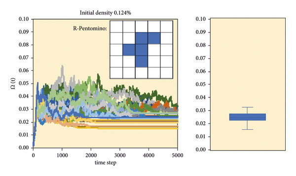 이 섹션에서는 대체 설정을 고려하고 앞서 언급한 결과가 초기 조건의 특정 아티팩트인지 특정 규칙 세트인지에 대해 질문합니다. 지금까지 GoL은 여기에 제시된 연구에서 살아있는 세포의 무작위 분포 분포를 사용하여 항상 연구되었습니다. "R-펜토미노" 구성[ 28 ]이라는 간단한 구조는 비어 있는 세계에서 단 5개의 인접한 살아있는 세포로 시작하여 인상적인 성장을 보이는 것으로 알려져 있습니다 . 이를 통해 GoL이 초기 인구 밀도와 관련하여 매우 낮은 시작점에서도 관찰된 LTNPD에 접근하는지 테스트할 수 있습니다.