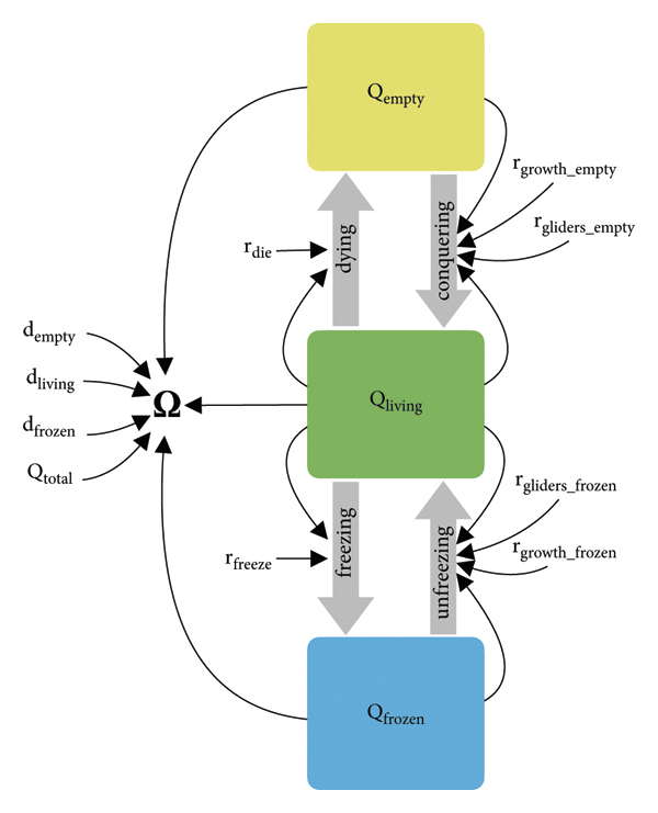 그림 6 의 색상 상자는 해당 모델의 주요 시스템 변수, 즉 특정 상태의 사분면 수량을 나타냅니다. 회색 두꺼운 화살표는 한 상태에서 다른 상태로의 사분면 전환을 나타냅니다. 검은색 가는 화살표는 시스템 구성요소의 인과적 종속성을 나타냅니다. 상자가 없는 텍스트 요소는 모든 상수 매개변수와 유일한 기타 시스템 변수를 나타냅니다 . 이 초점 거시적 변수는 이들 3개 사분면 모집단의 비율, 이들 사분면이 나타내는 인구 밀도( , , ) 및 사분면 의 절대 수를 기반으로 예측할 수 있습니다. 네 가지 고유한 흐름은 한 유형에서 다른 유형으로의 사분면 전환을 설명하여 시스템의 질량 보존을 보장합니다. 이러한 흐름은 다음과 같이 모델링됩니다. (나)"살아있는" 사분면의 일부는 두 계수 와 에 의해 설정된 비율로 얼거나 비워질 수 있습니다 . 이 프로세스는 그림 6 에 왼쪽 두 흐름을 가리키는 두 개의 얇은 검은색 화살표로 표시되어 있으므로 기존의 동결 및 빈 사분면 모집단과 독립적입니다 . 이러한 흐름은 및 의 영향을 받지만 및 의 영향을 받지 않습니다 .(ii)"동결된" 사분면 중 일부는 다시 살아날 수 있습니다(동결 해제). 이는 "살아있는" 사분면에서 발생하는 활동으로 인해 발생할 수 있습니다. 이러한 상호의존성은 대량행동법 용어로 가장 잘 표현됩니다., 두 계수의 합을 곱합니다. 계수는살아있는 세포 집단이 사분면 경계를 넘어 증가하고 인접한 사분면에서 "살아있는" 과정을 다시 시작하는 속도를 나타냅니다. 또 다른 계수는"살아있는" 사분면이 "동결된" 사분면에 들어가 그곳에서 "살아있는" 과정을 다시 트리거하는 글라이더 또는 기타 움직이는 구조물을 생성하는 속도를 나타냅니다.(iii)유사하게 빈 사분면의 일부는 두 가지 유사한 과정을 통해 생명으로 다시 정착될 수 있습니다. 즉, 성장을 통해 인접한 "살아 있는" 사분면에 의해 정복되거나( ) 잠재적으로 먼 "살아 있는" 사분면에서 유래하는 두 개의 글라이더에 의해 부트스트랩 됩니다 ( ). 두 프로세스 모두 집단 소송법 용어로 가장 잘 모델링됩니다.왜냐하면 "살아있는" 사분면과 상호작용하는 빈 사분면이 모두 필요하기 때문입니다.