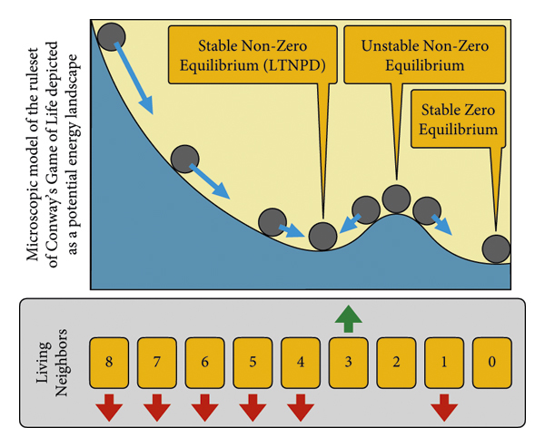 그림 5는 이러한 미세한 접근 방식의 간단한 그래픽 표현을 보여줍니다. 여기서 화살표는 무어 근처에 있는 살아있는 세포의 로컬 밀도를 기반으로 하는 세포의 개별 업데이트를 기반으로 인구가 어느 방향으로 발전하는 경향이 있는지 보여줍니다. 이는 개별 세포 행동이 전체 살아있는 세포 밀도의 변화로 이어지지 않는 세 가지 뚜렷한 사례를 나타냅니다.(1)평균적으로 4~8개의 살아있는 이웃이 있는 세포는 우선적으로 죽습니다. 따라서 인구 밀도는 결과적으로 감소하는 반면 (평균) 살아있는 세포 3개 크기의 살아있는 이웃 크기는 새로운 살아있는 세포의 탄생으로 이어질 수 있습니다. 이는 인구밀도를 높이는 데 기여할 것입니다. 이는 셀이 (평균적으로) 3~4개의 이웃을 갖는 조건에서 평형 밀도가 있음을 나타냅니다. 이는 8개의 이웃 그리드 셀 집단에서 평균 3.5개의 살아있는 세포의 안정적인(규제된) LTNPD를 암시하며, 이는 그리드 셀당 3.5/8 = 0.4375개의 살아있는 세포 밀도에서 LTNPD가 예상되어야 함을 나타냅니다. 시스템은 43.75%의 안정적인 평형 인구 밀도를 나타냅니다.(2)평균적으로 2개의 살아있는 이웃이 있는 세포는 시스템의 그리드 셀당 2/8 = 0.25개의 살아있는 세포로 이웃당 2개의 살아있는 세포에서 평형을 구성해야 하며, 미세한 역학에 존재하는 이 밀도에 대한 명확한 규제는 없습니다. 이는 불안정한 평형 인구 밀도가 25%임을 나타냅니다.(삼)평균적으로 2개 미만의 살아있는 이웃이 있는 세포는 우선적으로 죽습니다. 따라서 인구 밀도는 0으로 감소합니다. 이는 안정적인 평형 인구 밀도가 0%임을 나타냅니다.