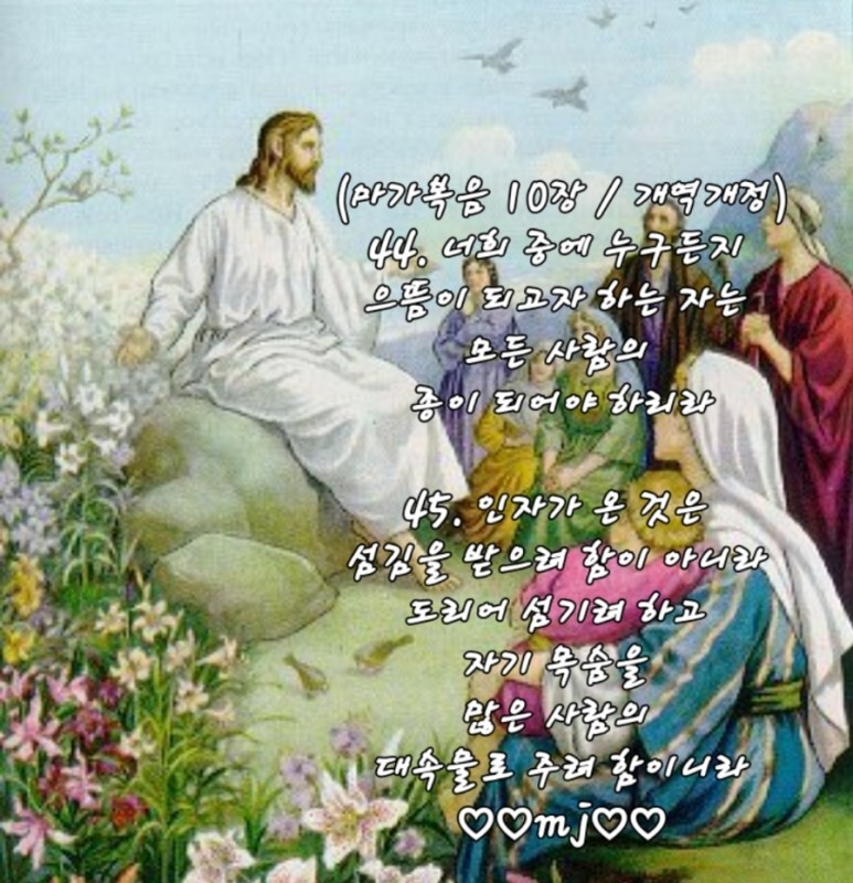 막10: 44. 너희 중에 누구든지 으뜸이 되고자 하는 자는 모든 사람의 종이 되어야 하리라 45. 인자가 온 것은 섬김을 받으려 함이 아니라 도리어 섬기려 하고 자기 목숨을 많은 사람의 대속물로 주려 함이니라