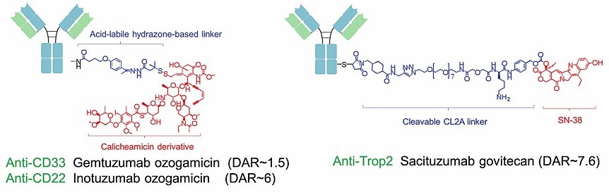 그림 1. 승인된 항체-약물 접합체(ADC)의 도식적 표현. (진 외 , 2022)