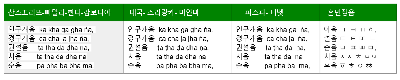 많은 학자들이 이 훈민정음이 왜 ㄱ ㅋ ㄲ ㆁ의 순서로 만들어 졌는지 침묵하고 세종대왕이 만들었다는 것만을 강조하고 있다. 그러나 범어와 빠알리어를 공부해본 사람들은 훈민정음이 왜 ㄱ ㅋ ㄲ ㆁ의 순서로 만들어 졌는지 금방 안다. 세종이 훈민정음을 만든 다음해(1444년)에 최만리(萬理) 등에게 상소를 받고 "네가 운서(韻書)를 아느냐. 사성 칠음(四聲七音)에 자모(字母)가 몇이나 있느냐?"라고 물을 수 있었던 것은 세종은 이미 범어의 자음체계를 따르는 운서를 모방하여 사성칠음(四聲七音)의 체계로 훈민정음을 만들었기 때문이다. 이렇게 훈민정음의 자음체계는 범어의 자음체계와 발음체계를 그대로 따랐고 창제원리는 중국운서의 내용을 그대로 옮겨왔다. 훈민정음이 만들어질 때 이미 중국에서 범어의 영향으로 다양한 운서가 나타났고 그 운서들이 조선에 영향을 주었다.다른 언어들보다 가장 늦게 만들어진 훈민정음이 범어의 영향을 받았다는 것은 너무도 자연스러운 것이다. 범어의 과학적인 자음체계는 태국, 미얀마, 캄보디아, 티벳과 우리나라등 세계 75개 이상의 언어들에 영향을 끼쳤다.(그림4) 범어의 이러한 원리는 부처님 당시 브라흐미문자부터 현대 인도의 데와나가리 문자에 이르기까지 지역에따라서 나라에 따라서 문자는 바뀌였지만 그 음가는 2700년간 고스란히 유지되고 있다.(그림5)