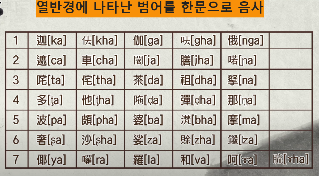 불교가 전해지면서 번역가들은 표음문자인 범어를 표의문자인 중국어로 표기하고 번역해야 했다. 첫 번역은 중국인들이 아니라 천축국 승려들이 담당했다. 천축국 승려들이 중국말을 배워서 범어 𑀓(ka) 𑀔(kha) 𑀕(ga) 𑀖(gha) 𑀗(ṅa)를 범자의 음가에 대응하는 한자를 찾아서 그대로 표기하였다. 400년경에 담무참(385~433년)이 번역한 '대승대반열반경'에는 범어의 36자음자가 한자로 표기되어있다.(그림3) 그런데 범어 자음의 음가와 정확히 대응되는 한자가 없는 경우도 있었다.