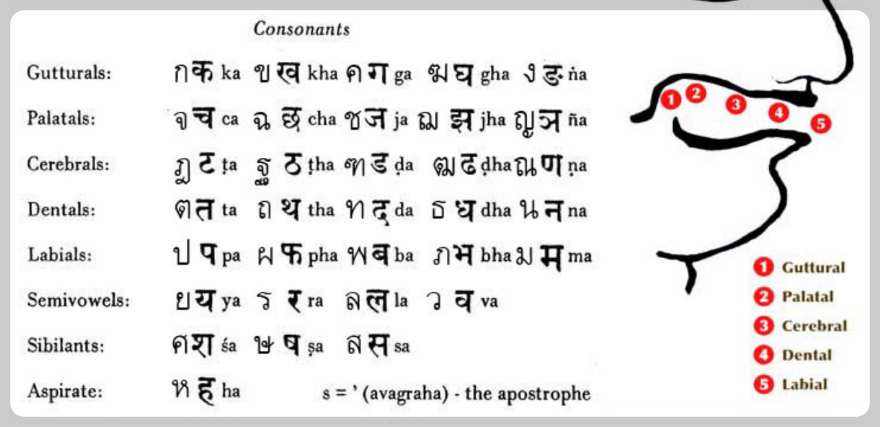 | 연구개음 ka kha ga gha ṅa 경구개음 ca cha ja jha ña 권 설 음 ṭa ṭha ḍa ḍha ṇa 치 음 ta tha da dha na 순 음 pa pha ba bha ma 반모음 ya va 유활음 ra la ḷa 마찰음 śa ṣa sa 기식음 ha 억제음 aṁ |